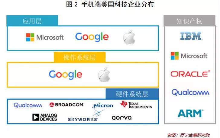 手機(jī)端技術(shù)可粗略歸納為3個(gè)不同層次,它們是應(yīng)用層、操作系統(tǒng)層和硬件系統(tǒng)層,其中,應(yīng)用層和操作系統(tǒng)層是軟件。貫穿這3層的還有知識(shí)產(chǎn)權(quán)類產(chǎn)品,它以專利授權(quán)的形式體現(xiàn),很多情況下都不涉及具體軟件和硬件實(shí)體。下面,我們具體來(lái)看一下手機(jī)端有哪些有實(shí)力的美國(guó)科技公司,以及他們所在的技術(shù)層。