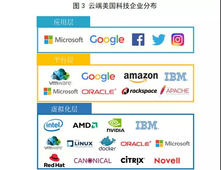 在虛擬化層,美國(guó)科技企業(yè)在全球具有壟斷性技術(shù)優(yōu)勢(shì),這些企業(yè)在技術(shù)版圖上呈現(xiàn)階梯型分布:首先,Intel、AMD、Nvidia和IBM作為芯片制造商,提供芯片架構(gòu)與處理器指令集的虛擬化技術(shù);其次,威睿(VMware)、微軟、Linux基金會(huì)(美國(guó)非盈利組織掌握Linux內(nèi)核開發(fā))提供操作系統(tǒng)內(nèi)核虛擬化技術(shù);在被業(yè)內(nèi)稱為輕量級(jí)虛擬化技術(shù)的容器技術(shù)領(lǐng)域,也有Docker這樣的美國(guó)企業(yè)占據(jù)市場(chǎng)主導(dǎo)地位;最后,還有甲骨文、紅帽(Red Hat,隸屬IBM旗下)、Canonical、思杰(Citrix)、網(wǎng)威(Novell)提供企業(yè)級(jí)虛擬化產(chǎn)品。