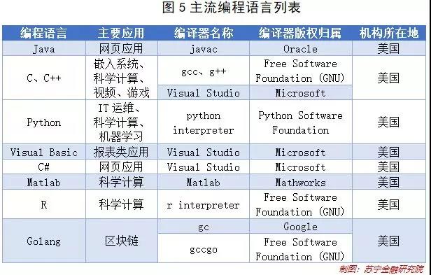 在這些編程語(yǔ)言當(dāng)中,有很多已成為國(guó)際標(biāo)準(zhǔn)。需要指出的是,雖然語(yǔ)言本身已成為國(guó)際標(biāo)準(zhǔn),但其具體實(shí)現(xiàn)(專業(yè)術(shù)語(yǔ)叫編譯器)還是有版權(quán)的。以下表格匯總了上述編程語(yǔ)言的主要應(yīng)用場(chǎng)景、主流編譯器、以及版權(quán)歸屬情況。從中可以看到,這些語(yǔ)言的主流編譯器的版權(quán)均為美國(guó)公司或美國(guó)非盈利機(jī)構(gòu)所有。
